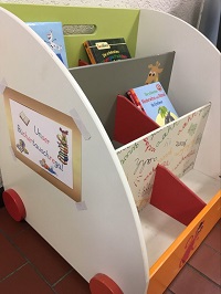 Vor der Bücherei steht ein Büchertauschregal, in das Schüler/innen ausgemusterte Bücher einfach hineinlegen und sich andere Bücher dafür herausnehmen können.